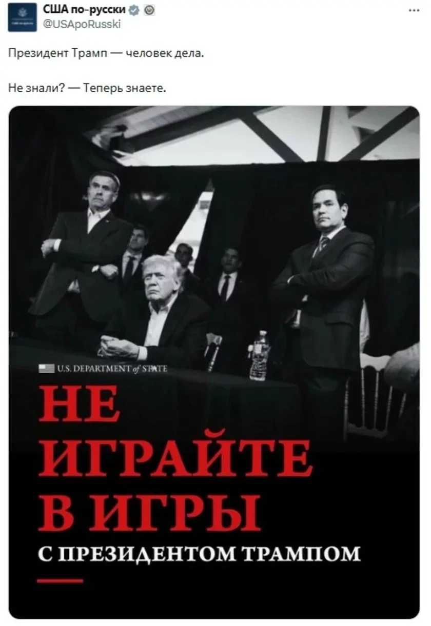 Госдепартамент США опубликовал в соцсетях обращение на русском языке с предупреждением «не играть в игры» с Дональдом Трампом.